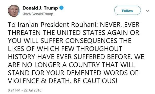 据信,这条“推文”是在回应伊朗总统哈桑·鲁哈尼当天早些时候的一次讲话,鲁哈尼警告华盛顿不要“玩弄狮子的尾巴”,与伊朗发生的冲突将会成为“全部战争之源”。