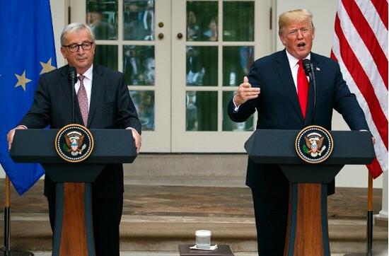 当地时间周三,美国总统特朗普和欧盟委员会主席容克在共同会见记者时宣布,美国和欧盟就缓和当前紧张的贸易关系达成协议,双方表示,将致力于消除关税和贸易壁垒,避免当前一触即发的贸易战。美国同意不向欧洲汽车加征关税,欧盟则同意进口更多美国大豆和天然气。