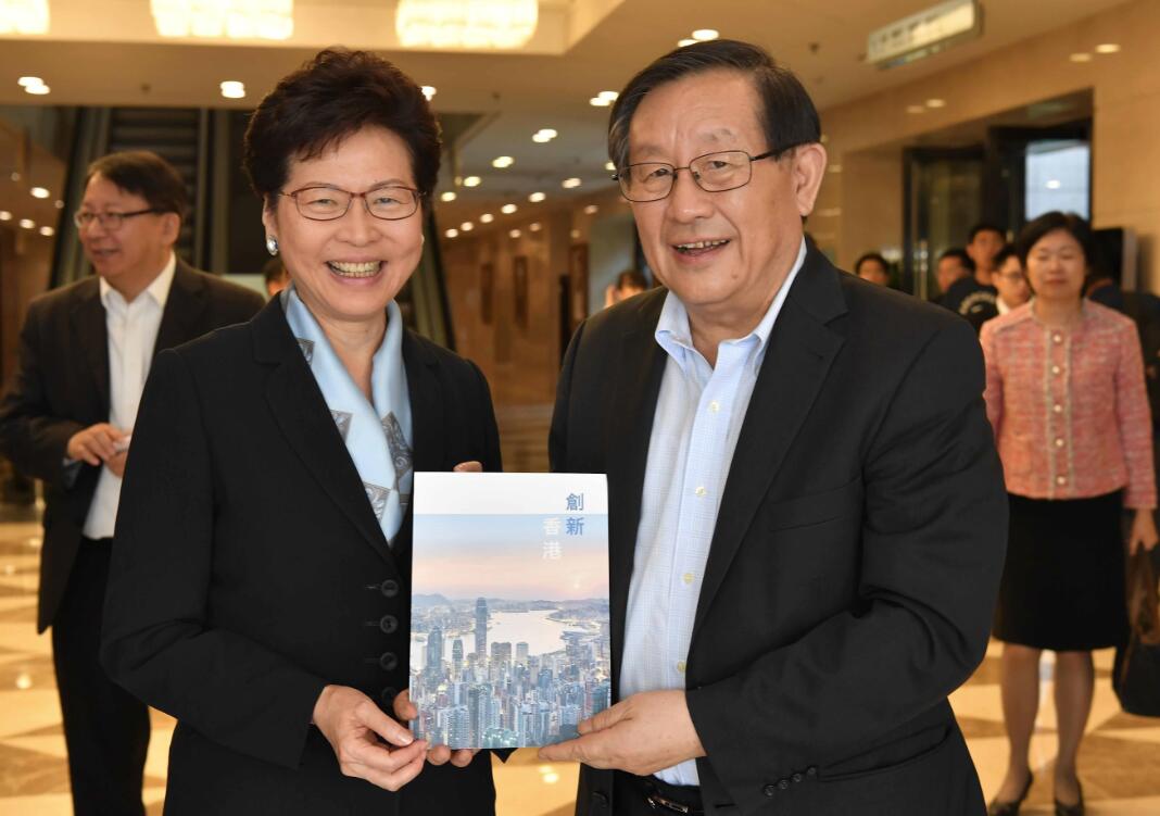 林鄭昨拜訪了萬鋼(右)并送赠由创科局编纂的《创新香港》。