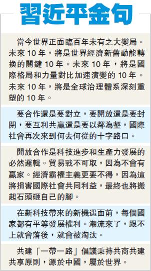 習近平指出,今年是中國改革開放40周年。40年來,中國走過了不平凡的歷程,成功開辟了中國特色社會主義道路。中國人民在實現自身發展的同時,為人類和平與發展的崇高事業作出了重要貢獻。我們將積極開展南南合作,努力為新興市場國家和發展中國家共同發展創造更大機遇。我們將繼續敞開大門搞建設,繼續創造更具吸引力的投資環境,加強知識產權保護,主動擴大進口,繼續大力推進「一帶一路」建設,為各國經濟社會發展、落實2030年可持續發展議程開辟新空間。