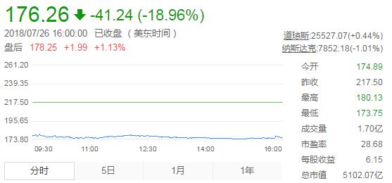 财报不及预期也导致FB股价大跌。在7月25日股价一度触及218美元的历史新高,公布财报后股价迅速暴跌,最终176美元收盘,跌幅18.96%,市值下跌约1200亿美元(约合9400亿港元),至约5102亿美元。截至周三收盘,Facebook的市值总计近6300亿美元。