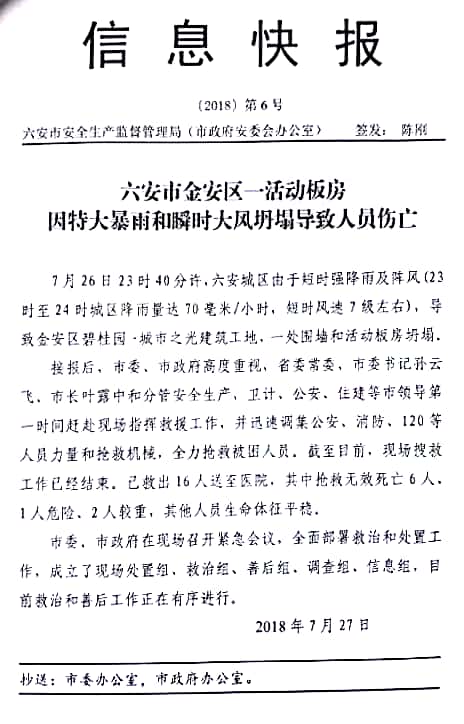 7月27日早上,六安市通报称,金安区碧桂园·城市之光建筑工地发生一处围墙和活动板房坍塌。目前,现场搜救工作结束,已救出16人并送至医院,其中抢救无效死亡6人、1人伤情危急、2人伤势较重,其他人员生命体征平稳。救治和善后工作正在有序进行。