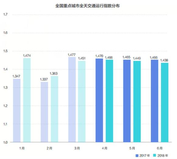 报告数据显示,二季度,四、五、六月全国重点城市全天交通运行指数分别为1.466、1.449和1.438,四月份依旧为二季度的最堵月份。