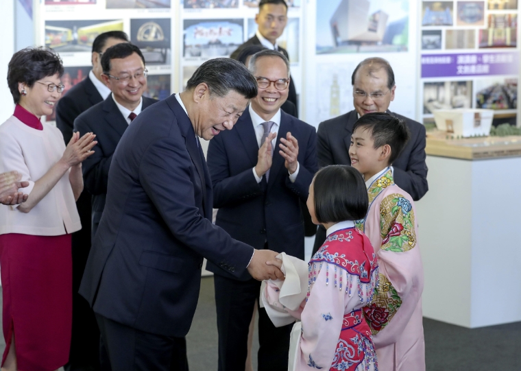 國家主席習近平去年視察香港期間,就曾與昨晚演出的兩名粵劇小演員利文喆(右)和陸瑞徽親切交談。 資料圖片