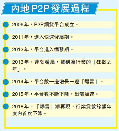 P2P原本的概念是個人對個人的借款,又稱點對點網絡借款,屬於民間小額借貸,指的是藉助互聯網、移動互聯網技術提供信息發布和交易實現的網絡平台。對於P2P來說,投資人和借款人是其資金的兩個出入口,當市場流動性出現問題或者投資者信任崩塌時,投資方集中擠兌行為的出現將令平台無法正常運營。此外,這些平台運營中普遍有?資金錯配、期限錯配等問題,一旦整體大環境不好,「爆雷潮」便會出現。