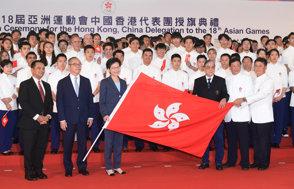 行政長官林鄭月娥(前左三)主持亞運會中國香港代表團授旗禮。