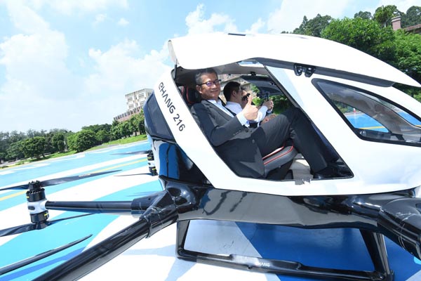 陳茂波參觀廣州一間專注研發智能飛行器高科技創新企業並試坐研發產品。
