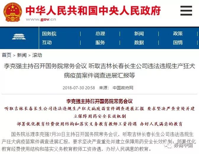 7月30日晚间,中国政府网发布消息称,30日召开的国务院常务会议上,李克强总理听取了吉林长春长生公司违法违规生产狂犬病疫苗案件调查进展汇报,要求坚决严查重处并建立保障用药安全长效机制。