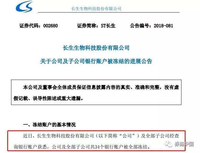 ST长生发布公告称,截至本公告披露日,公司及全部子公司名下34个银行账户全部被冻结,上述账户的冻结对公司日常经营管理活动将产生重大影响。