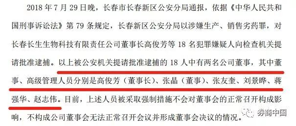 ST长生发布公告称,董事长及部分高管无法正常履职。7月29日晚,公司18人被公安机关提请批准逮捕,其中包含董事、高级管理人员分别是高俊芳(董事长)、张晶(董事)、张友奎、刘景晔、蒋强华、赵志伟。