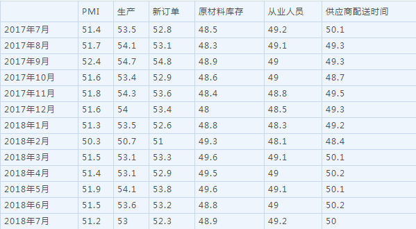 2018年7月份,中国制造业采购经理指数(PMI)为51.2%,比上月回落0.3个百分点,高于临界点,制造业继续保持增长态势。