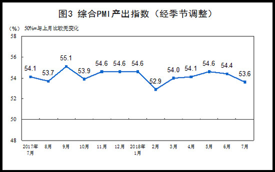 2018年7月份,综合PMI产出指数为53.6%,低于上月0.8个百分点,表明我国企业生产经营活动总体继续保持扩张,但步伐放缓。