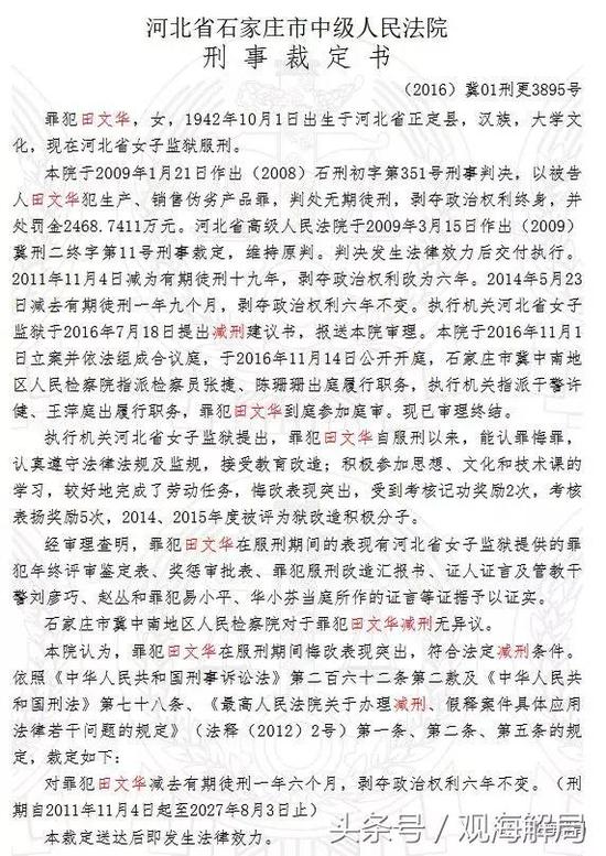 2016年年底,中国裁判文书网发布了(2016)冀01刑更3895号裁定书,裁定书显示,罪犯田文华,女,1942年10月1日出生于河北省正定县,汉族,大学文化,现在河北省女子监狱服刑。
