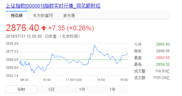 7月31日消息,今日两市小幅低开后,维持横盘震荡,午后在银行、证券等金融股走强下,沪指创日内新高,市场做多氛围有所回暖,但尾盘三大股指集体下挫,市场人气再度受挫,整体上全天维持宽幅震荡,截止收盘,沪指报2876.40点,涨0.26%,深成指报9178.78点,跌0.03%,创指报1561.26点,涨0.10%。
