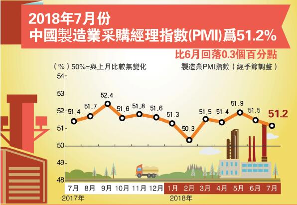 據國家統計局公布數據,中國7月官方制造業PMI51.2,略低於預測值51.3,也較前值51.5有所回落。分析認為,雖然PMI指數較前值有所回落,但制造業PMI指數繼續處於50分水嶺之上,連續24個月處於擴張區間,顯示制造業韌性較強。另有分析認為,大中小型企業繼續保持分化態勢,主要是因為融資增速放緩,中小企業融資難融資貴的情形進一步顯現,此外消費增速也有所放緩,或許會影響到下半年中國的經濟增速。不過,近期中國的貨幣政策已從穩中偏緊的基調,現在可能就變成了中性偏松的基調,未來的經濟走勢還需要看政策的效果。香港商報記者 伍敬斌