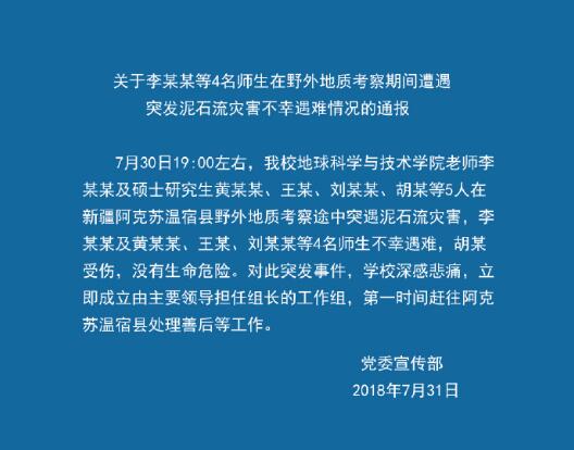7月31日晚,记者从西南石油大学了解到,该校一名老师带领4名硕士研究生在新疆阿克苏温宿县开展野外地质考察时,遭遇泥石流,造成含老师在内的4名师生不幸遇难。