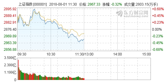 【香港商报网讯】8月1日消息,今日两市高开后,小幅冲高,创业板指一度涨逾1%,沪指在冲击2900点关口未果后,三大股指集体下挫,深成指率先翻绿,并不断走低,截止午间收盘,沪指报2867.33点,跌0.32%,深成指报9148.52点,跌0.33%,创指报1564.25点,涨0.21%。