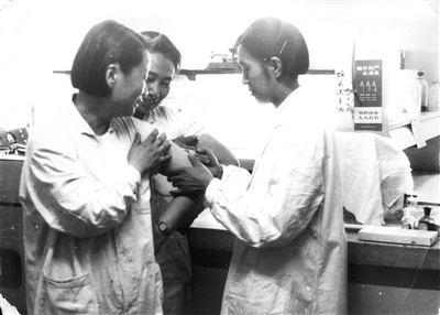 在肝病研究所保存的一张黑白照片上,陶其敏正在注射乙肝疫苗。当疫苗液体注入她身体的那一刻,她面带微笑,似乎正和身后的冯百芳交谈着什么,倒是一旁的护士脸上表情严肃,好像很紧张的样子。