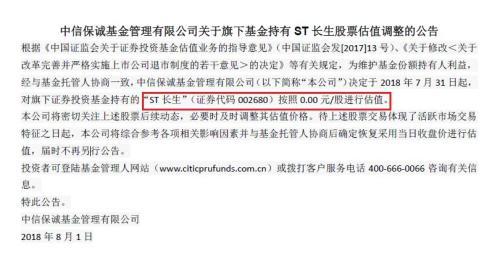8月1日,中信保诚基金发布公告,为维护基金份额持有人利益,7月31日起对旗下基金持有的“ST长生”按照每股0元进行估值。这意味着此前股价翻倍的“明星股”ST长生,如今在基金公司眼中已经一文不值,而其出事之前的市值达到239亿元。