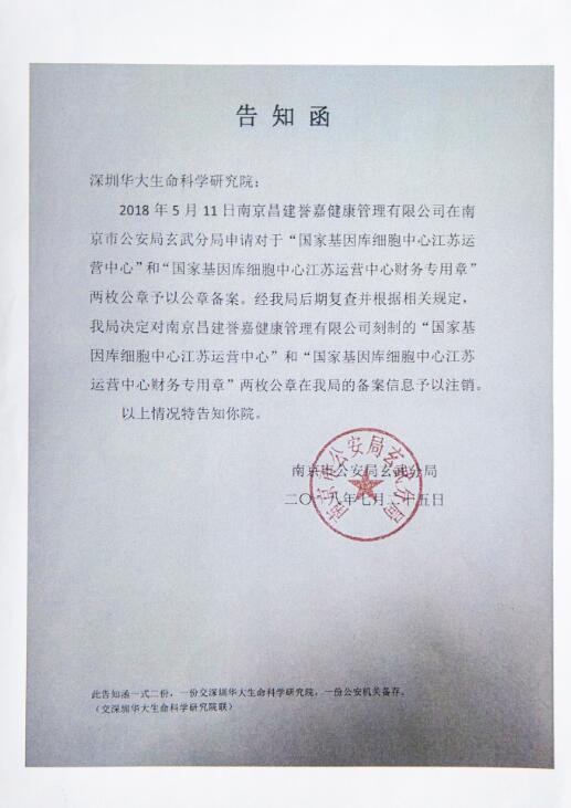 针对此前发生的“王德明举报案件”,华大集团助理总裁韦炜表示,关于双方解约的事实是南京昌健誉嘉违约在先,华大只是行使了法定解除权;且目前,华大就王德明和南京昌健誉嘉的侵权行为(侵犯名誉权和不正当竞争),已经在深圳和南京两地提起诉讼;南京市公安局玄武分局也已发布公告函,决定注销对南京建誉嘉健康管理有限公司刻制的“国家基因库细胞中心江苏运营中心”和“国家基因库细胞中心江苏运营中心财务专用章”两枚公章。