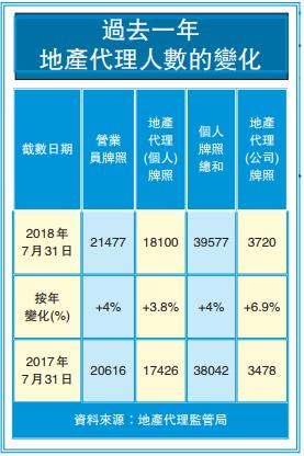 至於以公司為單位的牌照數目亦持續創新高。地產代理(公司)牌照7月錄得數字為3720,按年增長6.9%;至於反映分行數字的營業詳情說明書,7月按月多30間至7006,按年增長5.1%。