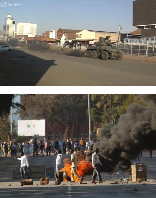 反对派支持者在哈拉雷的市中心抗议示威,有人利用金属棍棒和石头,摧毁街道上的红绿灯、店面等。有人焚烧杂物和车胎,并向警方丢掷石头。
