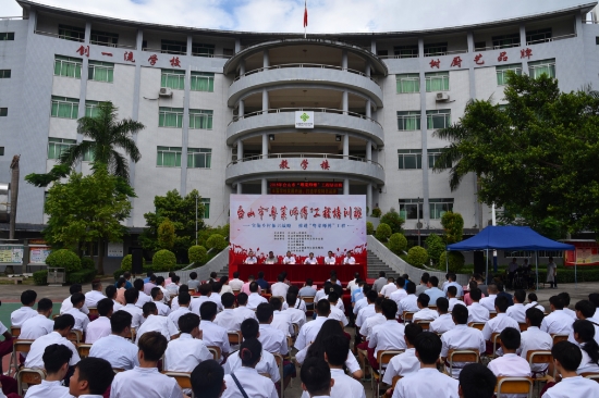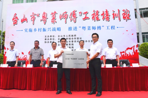 广东省各级党委政府高度重视“粤菜师傅”工程,省委书记李希指示,“以增加农民收入为目标,着力做好‘特’字文章,培育特色产业强镇强村,实施‘粤菜师傅’工程”,江门市委书记林应武指示,“实施‘粤菜师傅’工程,支持有意愿的农民群众参加专业培训,拓宽农民收入渠道”。台山市委、市政府认真贯彻落实,大力实施“粤菜师傅”工程。8月1日,台山市实施“粤菜师傅”工程的重要平台——江门市首个“粤菜师傅”培训基地在台山市广东厨艺技工学校正式挂牌并开班培训。首期培训班的100名学员,分别来自台山各个乡镇,其中有50名精准扶贫对象、25名低保户,还有25名有志从事餐饮行业的农村青年。江门市副市长梁许赞,台山市委副书记、市长谢少谋,副市长亓光勇以及江门、台山相关部门负责人出席挂牌仪式。