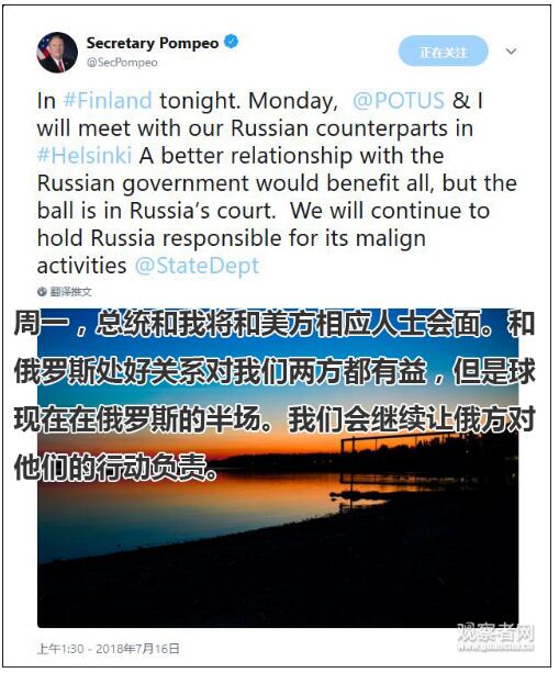蓬佩奥在普特会前暗示,叙利亚问题将由俄罗斯负责 图源:观察者网