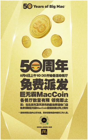 为了与中国消费者一起欢庆巨无霸50周年,中国内地指定麦当劳餐厅将于2018年8月6日当日免费送出超过100万枚MacCoin。早上10:30开始,顾客前往餐厅为巨无霸唱出生日歌[2],即可获得MacCoin一枚,图案随机,送完即止。北京市和天津市的顾客需2018年8月4日上午9:00起在“i麦当劳”微信小程序提前预约,方可于8月6日10:30起在指定麦当劳餐厅领取。顾客可以分享与收藏,也可以在2018年12月31日前凭MacCoin在中国内地、美国、荷兰、新西兰、巴西等全球超过50个国家和地区参与活动的麦当劳餐厅,免费兑换巨无霸一个。