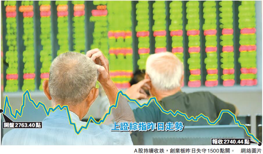 【香港商報网訊】A股市場昨日繼續下探,大幅縮量調整。截至收盤,上證綜指報2740.44點,跌1.00%;深證成指報8602.12點,跌2.03%;創業板指數報1481.61點,跌1.89%,失守1500點。