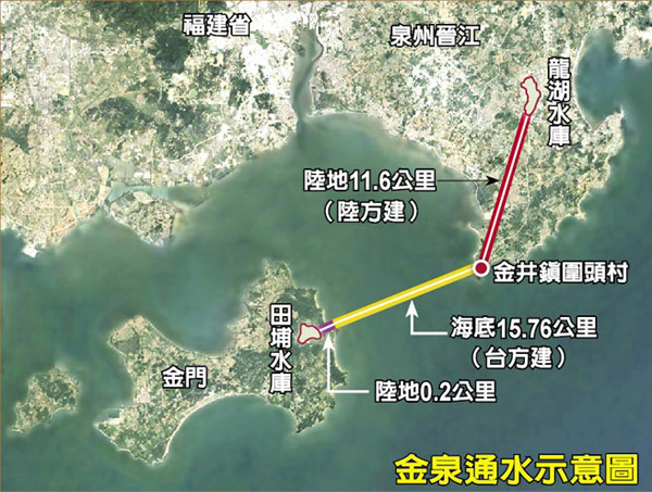 福建向金門供水工程由晉江龍湖取水泵站、陸地輸水管道和跨海輸水管道三部分組成,線路總長約28公里,工程總投資3.88億元人民幣。
