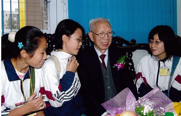 田家炳創立基金會致力社會公益,尤其重視教育。圖為他與內地中學生合照。 資料圖片