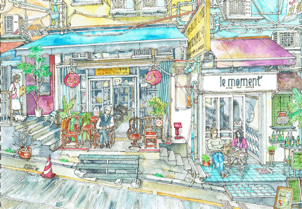 山口潔子在展覽中將展示三個不同地方的建築風景,「我認為它們都同樣具備歷史魅力,與是否註冊為一級歷史建築無關。」尽管她是建築系畢業,但對於新建的大廈并沒有興趣,認為只是一堆建築材料,她所認為的歷史魅力是有人居住的建築和使用的街道。如展品《京都·寺町三条·三嶋亭》和《Shin-setsu Soda Cafe》均是山口最喜歡的寺町商店街一角街景,有居民、有游客,是京都的日常生活面貌。繪畫亦將她無法留下的景色保存下來,《卑利街一景》中滿布綠色植物店舖已經搬走,而她在畫中「留住」了這間店;具有百年歷史的建築物和昌大押在多年前修復翻新,山口潔子筆下的《和昌大押》卻仍保留改建前的模樣。同時,還將展示極具香港特色的街道,《卑利街老舖》繪畫了斜坡和許多台階;《蘭桂坊一角》繪畫了人們如何穿越狹窄的街道,及避開的士和貨車到馬路對面等等。透過山口的作品,可以看到香港這座發展極速的城市同時兼容了「歷史性」,是否與大家印象當中的香港有所不同?