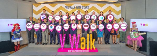 進駐新商場的商戶超過150個,涵蓋6大行業,而零售品牌占去70%。其中,包括嘉禾戲院;珠寶首飾店如六福珠寶、PANDORA;連鎖食店品牌如茶木、牛角、Starbucks、天仁茗茶以及其他行業的著名品牌。與此同時,V Walk亦獲幼稚園朗思國際承租,從而可確保以家庭為單位的客流量。V Walk附近亦有一間五星級酒店即將落成,項目將建設行人天橋,連接鄰近地區。
