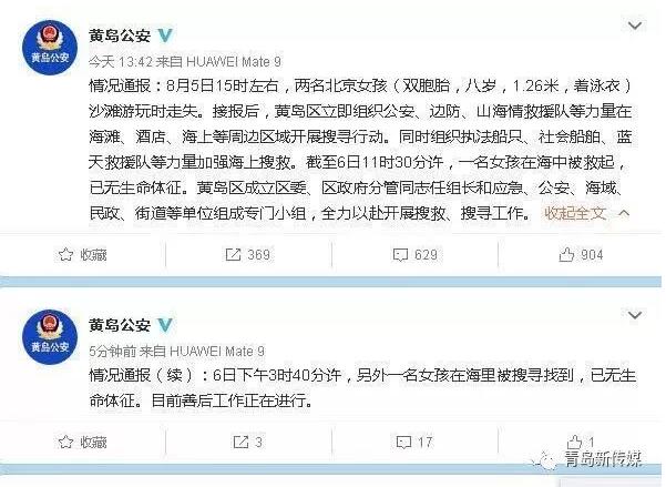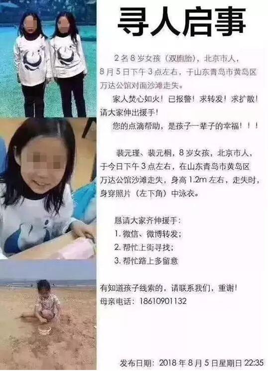 8月5日15时左右,北京一对8岁双胞胎姐妹在山东青岛黄岛万达公馆南侧沙滩游玩时失踪。6日,山东青岛黄岛警方通报,两名失踪女孩全部找到,但遗憾的是均无生命体征。目前善后工作正在进行。