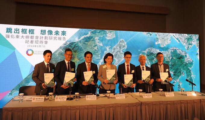 團結香港基金總幹事鄭李錦芬(中)等人介紹「強化東大嶼都會」計劃。