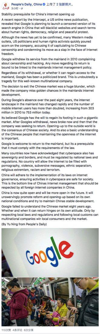 8 月 6 日,人民日报在社交媒体平台 Twitter、Facebook 上刊登了一篇标题为“Stability prerequisite for China’s internet opening up”(《稳定是中国互联网开放的重要前提》)的文章。