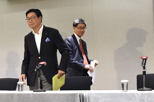 昨日,港鐵公布多名高層就沙中線工程事件離職。圖為港鐵主席馬時亨(左)與行政總裁梁國權(右)。中通社