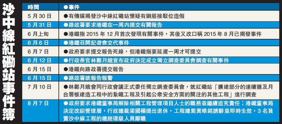 多月前被揭發的港鐵沙中線紅磡站鋼筋被剪短事件,昨有突破性進展。當日,運輸及房屋局局長陳帆率多位官員舉行記者會,稱已將相關資料轉交警方,並提交予獨立調查委員會,未來相信會有相關人士被追究法律責任。上周日(8月5日),政府即召開緊急會議,要求港鐵董事局徹查事件,立即解除沙中線工程項目管理人員的職務。