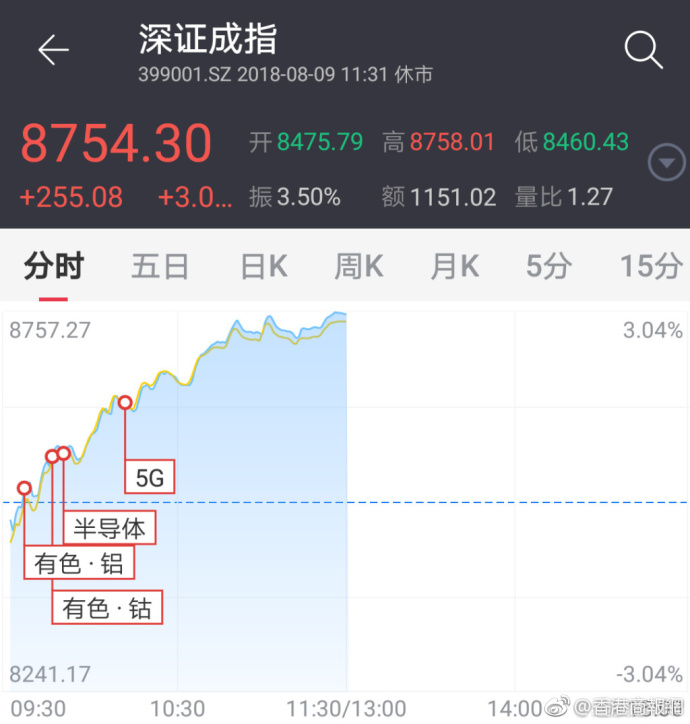 截至午间收盘,沪指涨1.78%,报2793.04点,成交869.37亿元;深证成指涨3%,报8754.30点,成交1151.02亿元;创业板指涨3.41%,报1497.16点,成交362.10亿元。