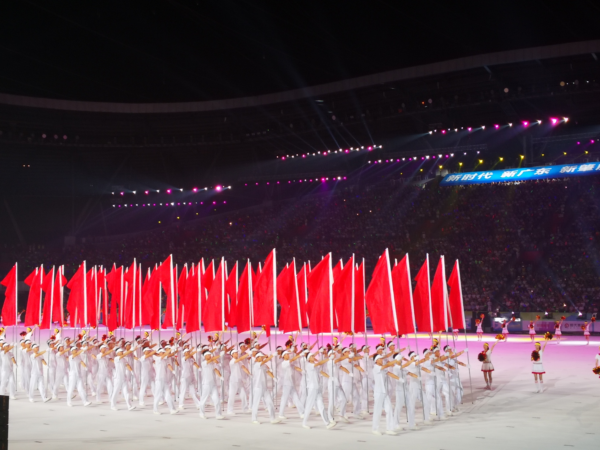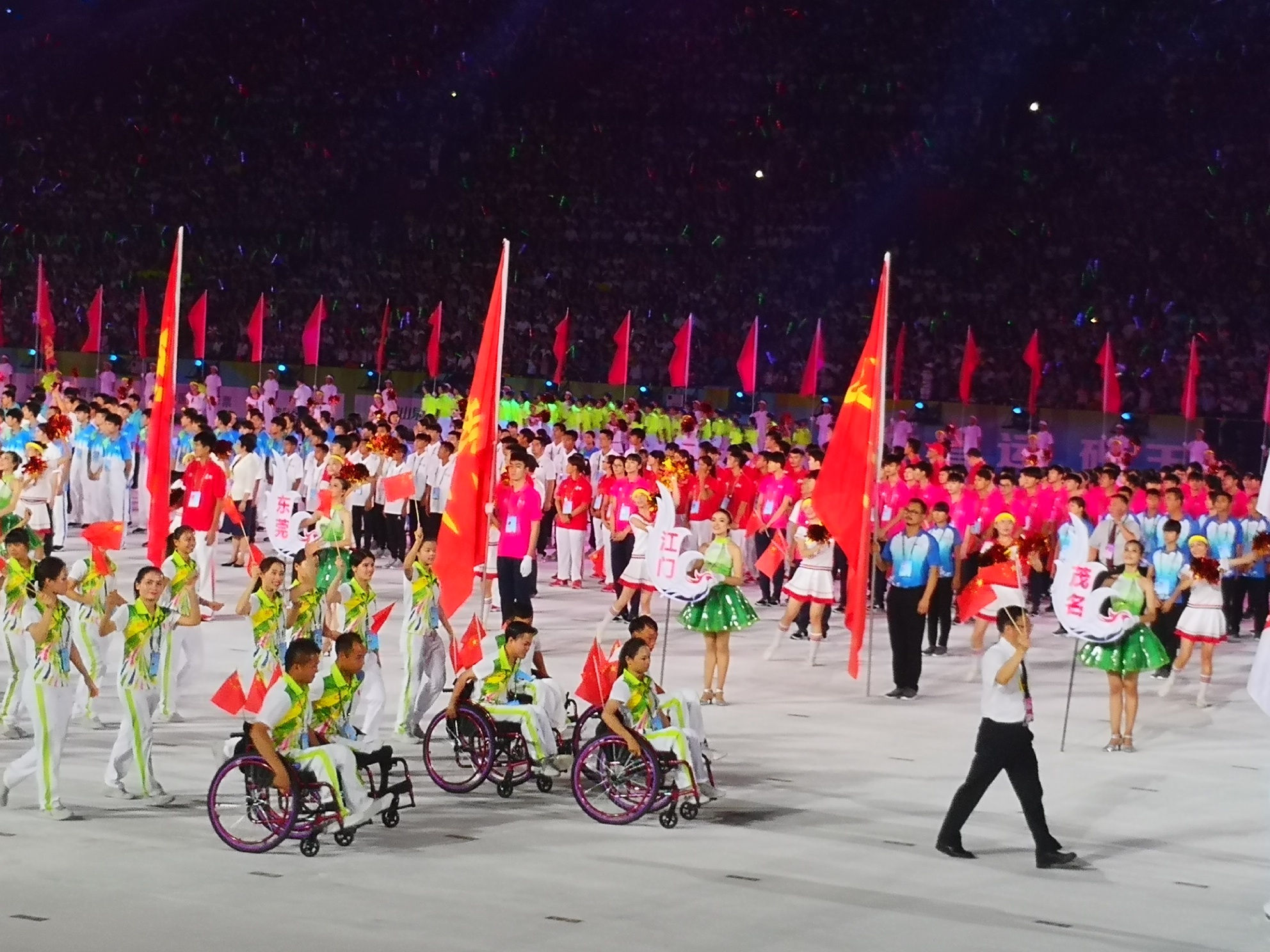 晚8时,开幕式正式开始,仪仗队、红旗队方阵、“魅力中国城”肇庆竞演战队方阵、裁判员队伍、22个参赛代表团和残疾人运动员方队依次进入开幕式会场。