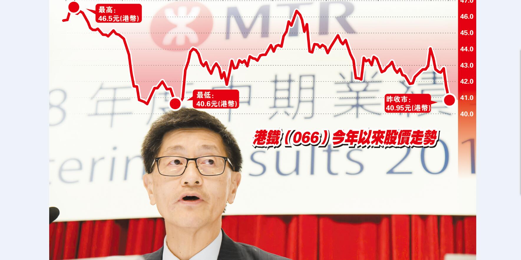 港鐵人事大地震後,前天復牌挫2.57%,收41.7元;昨早續跌至40.7元,跌2.4%。大行普遍看淡港鐵前景,惟亦有評級機構撐港鐵維持現有評級。例如,高盛證券指,港鐵項目超支是導致股價短期不明朗的因素,而對管理層換班及沙中線工程問題及其導致的結果未發表意見,只認為將會延長公司與政府就沙中線超支的談判過程。基於公司股價仍有下行空間,該行維持對港鐵的「沽售」評級,惟目標價由39元調高至42.5元。