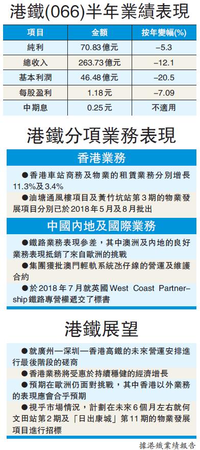 【香港商報网訊】記者馮金鋒、實習記者吳海綸報道:港鐵(066)昨日公布中期業績,上半年賺70.83億元,按年跌5.3%;期內,核心盈利46.48億元,按年跌20.5%。其中,經常性業務盈利44.83億元,按年僅增500萬元;物業發展盈利亦只有1.65億元,較上年同期大跌88%。每股基本盈利1.18元,擬派中期息每股0.25元,可以股代息,與去年同期相同。