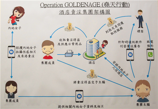 羅國凱續稱,利用酒店進行賣淫活動并非新犯罪手法,過去亦曾發生,今次破獲的賣淫集團主腦行事小心,只利用手機與妓女聯絡,從不露面;賣淫內地女通常透過旅客身份來港,通常逗留1星期,以密集交易方式「温錢」。集團會替賣淫女拍照,上載到手機程式進行宣傳,嫖客則由朋友輾轉相告獲得妓女信息,經手機程式進行交易。羅強調,違反逗留條件罪名同樣會判處監禁,依靠他人賣淫收入為生罪名,最高刑罰可判監禁10年。