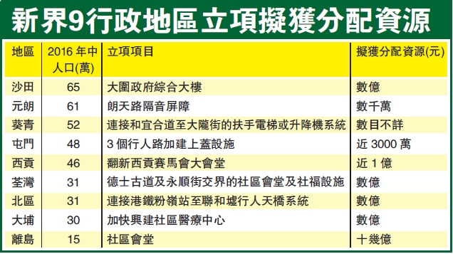 今屆政府在財政預算中預留80億元,以推展18區地區工程,并由民政事務局統籌資源分配予所需興建的社區綜合大樓或利便行人接駁設施等。近期,新界9個行政區已立項項目擬獲少至數千萬元,多則數億或者十幾億元不等的資源分配,惟是次資源分配方案與上屆政府平均每區獲1億元資源分配存在很大落差,故此,地區人士對今屆資源分配有赞有彈;赞者指可以集中資源興建社區會堂,彈者批評資源分配不公平,建議仍以地區人口分布作為考量分配資源。香港商報記者 周駿