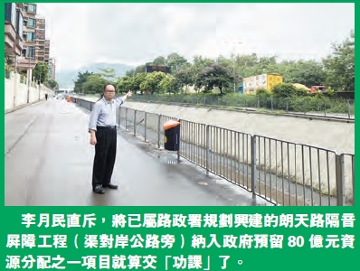 元朗區議會轄下地區設施管委會主席李月民議員直斥,預留80億元資源分配方案不公,他指非常不滿(方案),又無從發泄。今年5月中,元朗區議會已通過朗天路興建隔音屏障,該項工程由路政署於明年興建,然而,今次民政事務局將路政署這項工程,只是轉個牌頭便納入該局80億元工程項目算是對元朗區交了功課。