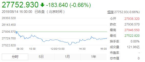 市场担忧土耳其经济危机进一步蔓延到其他地区,再加上个别重磅股业绩远逊预期,恒指今日继续承压。港股早盘窄幅高开1点报27938点,但其后跌幅扩大,最多跌400多点,低见27522点,截至收盘,恒指跌0.66%,报27752.93点,成交额扩大至1024.09亿。国企指数跌0.21%,报10744.31点。红筹指数跌0.87%,报4155.43点。