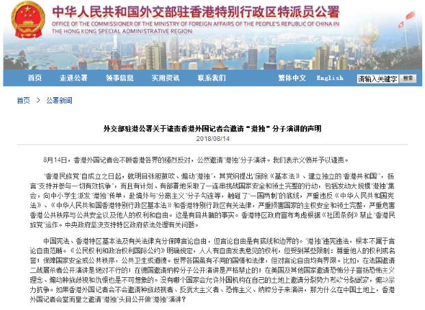 據外交部駐港公署網站消息,外交部駐港公署發表聲明表示,8月14日,香港外國記者會不顧香港各界的強烈反對,公然邀請“港獨”分子演講。我們表示義憤並予以譴責。