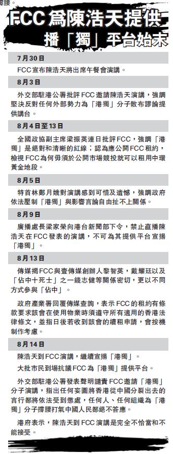記者葉佩瑜報道:對於香港外國記者會(FCC)邀請鼓吹「港獨」的「香港民族黨」召集人陳浩天演說,署理行政長官張建宗昨日指出,FCC的行為是不恰當、不合理,也是不能接受的,他對此深表遺憾。