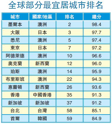 經濟學人比較全球140個城市、合共5項指標:穩定性、健康醫療、文化與環境、教育以及基礎建設,選出此榜單。香港去年排名第45名,今年跳升至35名,超越排名第37的新加坡。